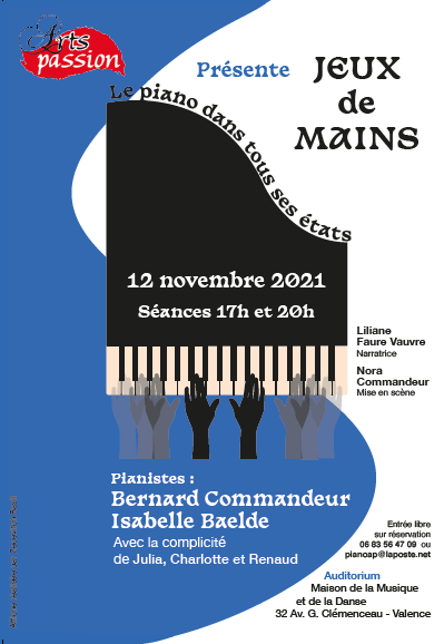 Vendredi 12 novembre 2021 à 17h, puis à 20h j’aurai le plaisir de participer au récital « Jeux de mains » concocté par Isabelle Baelde et Bernard Commandeur pour l’association Arts Passion. Ce concert retrace l’histoire du 4 mains et montre l’utilisation du piano « dans tous ses états ». Liliane Faure Vauvre sera la narratrice. Des surprises attendent le public… Je ne vous en dis pas plus, no spoilers!