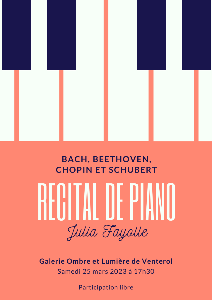J’ai le plaisir de jouer des pièces de Jean-Sébastien Bach, Ludwig van Beethoven, Frédéric Chopin et Franz Schubert, lors du vernissage de l’exposition des œuvres de Jean-Christophe Gondouin samedi 25 mars 2023 à 17h30 à la galerie Ombre et Lumière de Venterol.