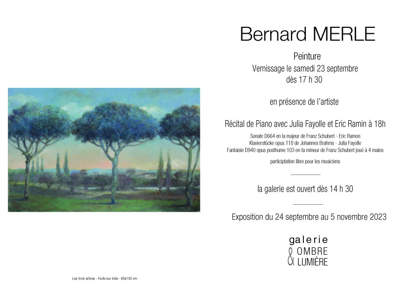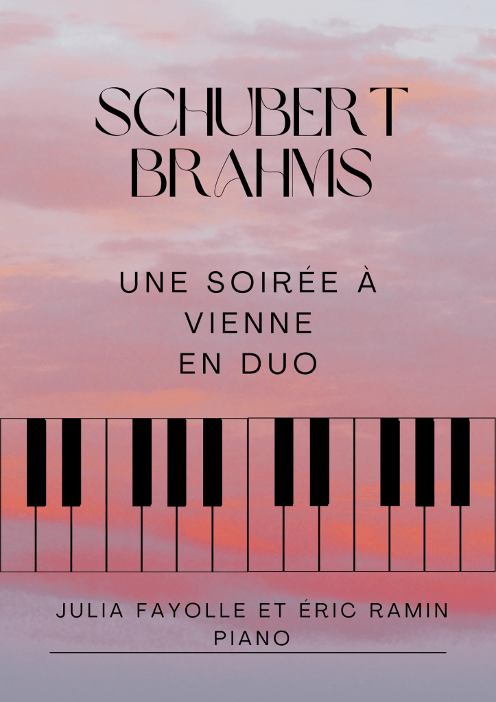 Samedi 23 septembre 2023 à 18h, avec le pianiste Eric Ramin, nous jouerons tantôt en solo, tantôt en duo lors du vernissage du peintre Bernard Merle à la galerie Ombre & Lumière de Venterol. Lors de cette soirée, nous interprèterons des œuvres romantiques de deux « grands » compositeurs ayant vécus à Vienne : Franz Schubert (de sa naissance à sa mort) et Johannes Brahms (lors des 35 dernières années de sa vie).
