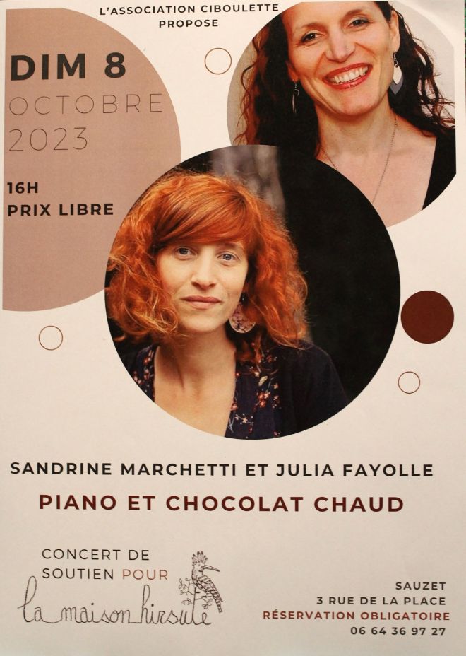 Dimanche 8 octobre à 16h, j’aurai le plaisir de jouer la Sonate D960 en si b majeur de Franz Schubert en première partie d’un concert de soutien pour l’aménagement d’un nouveau lieu de création artistique : la maison hirsute de Sauzet. En seconde partie, vous pourrez écouter un conte musical par la pianiste de jazz Sandrine Marchetti. Tout ceci en dégustant un chocolat chaud confectionné par nos hôtes : Marion Boulé et Sébastien Eschalier. Un moment chaleureux en perspective!