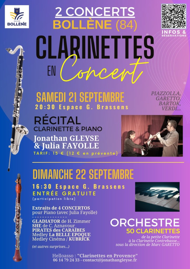 Le week-end prochain, j’aurai l’honneur de jouer à la salle Georges Brassens de Bollène avec près de 50 clarinettistes lors de deux concerts!