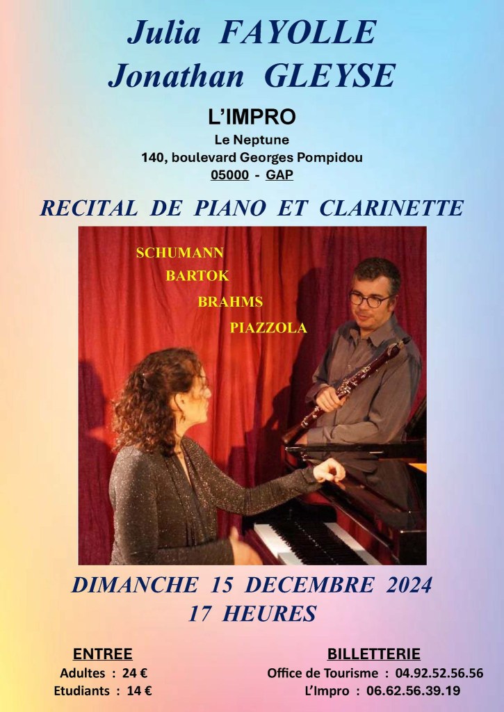Dimanche 15 décembre prochain à 17h, j’aurai le plaisir de jouer avec le clarinettiste Jonathan Gleyse à l‘espace polyvalent L’impro à Gap. J’ai hâte de découvrir le piano Steinway sur lequel je jouerai ! Nous interprèterons notre récital Schumann, Brahms, Bartók et Piazzolla. N’hésitez pas à venir partager cette soirée autour d’œuvres romantiques ou dansantes de ces quatre compositeurs !