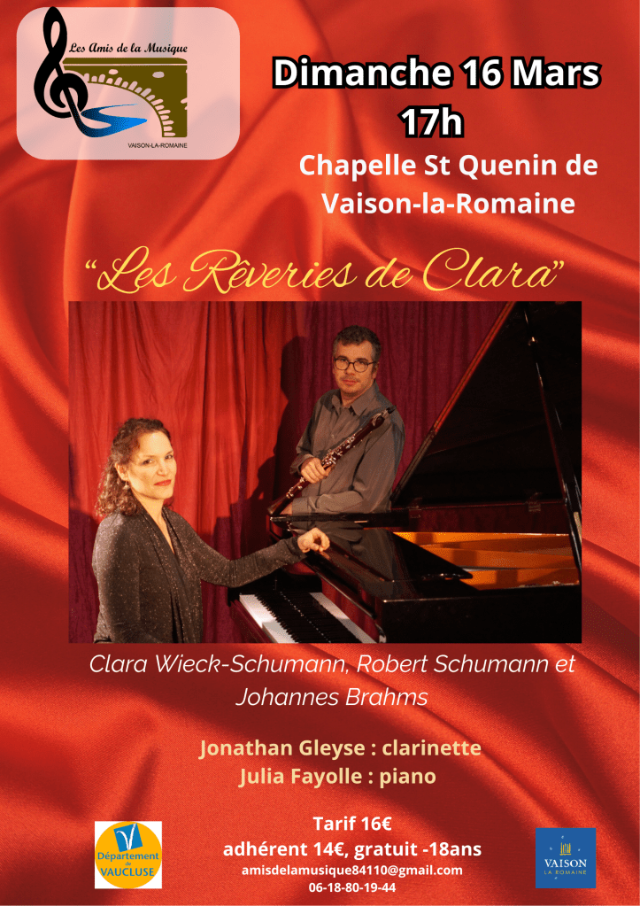 Dimanche 16 mars 2025 à 17h, j’aurai le plaisir de jouer avec le clarinettiste Jonathan Gleyse notre récital Les rêveries de Clara lors du concert d’ouverture de la saison 2025 des Amis de la musique à la Chapelle Saint Quenin de Vaison-la-Romaine. Nous vous interpréterons des œuvres de Clara et Robert Schumann et de leur ami Johannes Brahms. Ce sera l’occasion de vous narrer les liens entre ces trois musiciens et compositeurs, des bouts de leurs histoires et de partager avec vous la beauté de leur musique. A l’affiche de ce programme tour à tour fusionnel, passionné et intimiste, vous pourrez entendre : les Romances opus 94 de Robert et celles opus 22 de Clara, la deuxième Sonate opus 120 pour clarinette de Johannes et les Fantasiestücke opus 73 de Robert.