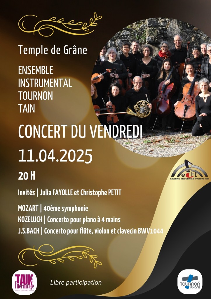 Le 11 avril prochain à 20h, j’aurai le bonheur de jouer en quatre mains avec Christophe Petit le Concerto de Léopold Kozeluch au Temple de Grâne. Accueillis par l’association A.G.A.P. pour ses Concerts du vendredi 2024/2025, nous aurons le plaisir d’être accompagnés par l’Ensemble Instrumental de Tournon-Tain dirigé par la talentueuse Lise Péchenart.