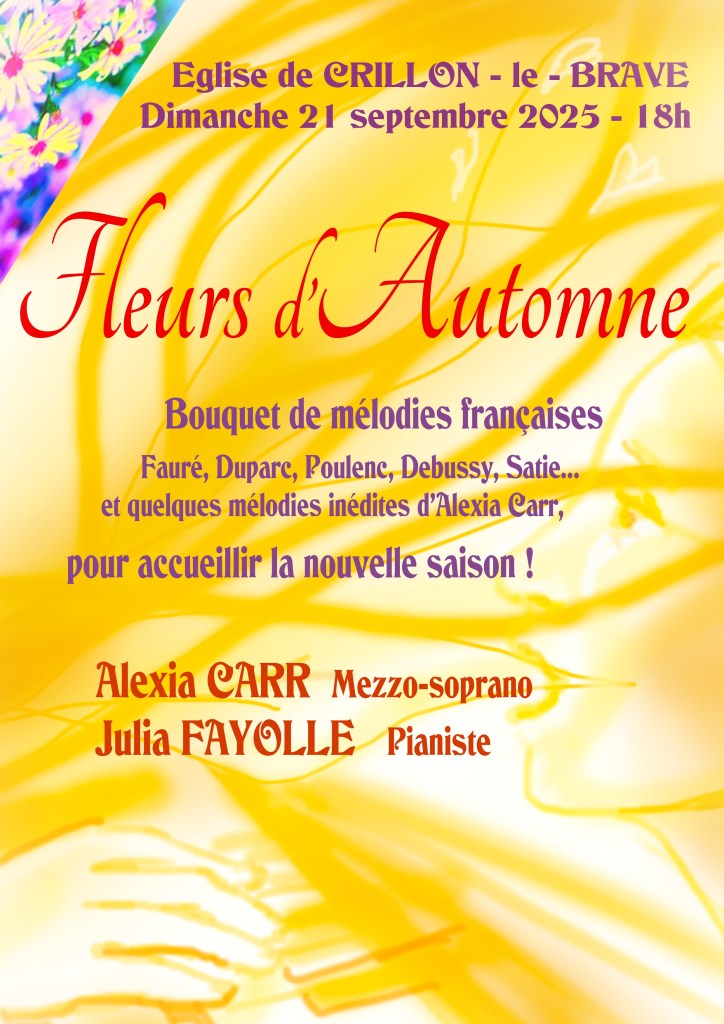 Invitée par l’association Art et Culture, je me réjouis de partager l’affiche le 21 septembre prochain à 18h avec la mezzo-soprano Alexia Carr dans la magnifique église de Crillon-le-Brave ! En cet soirée d’équinoxe automnale, nous vous interpréterons des mélodies pour voix et piano de Gabriel Fauré, Reynaldo Hahn, Francis Poulenc, Erik Satie, Claude Debussy, Hector Berlioz, Henri Duparc, Georges Bizet et… Alexia Carr !