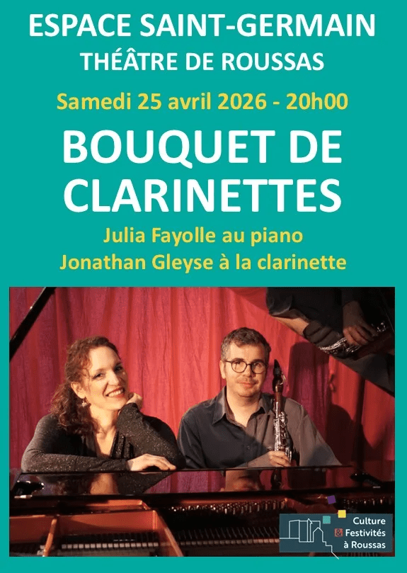 Samedi 25 avril prochain à 20h, nous sommes invités, avec le clarinettiste Jonathan Gleyse, par l’association Culture & Festivités à Roussas pour interpréter notre récital Bouquet de clarinettes ! Nous serons heureux de partager avec le public de l’Espace Saint-Germain, un assortiment de pièces délicates et variées, écrites ou arrangées pour clarinette et piano : de Wolfgang Amadeus Mozart, en passant par Gabriel Fauré ou encore Sergueï Rachmaninov, Robert Schumann ou Gabriel Pierné, à Bélà Bartók.